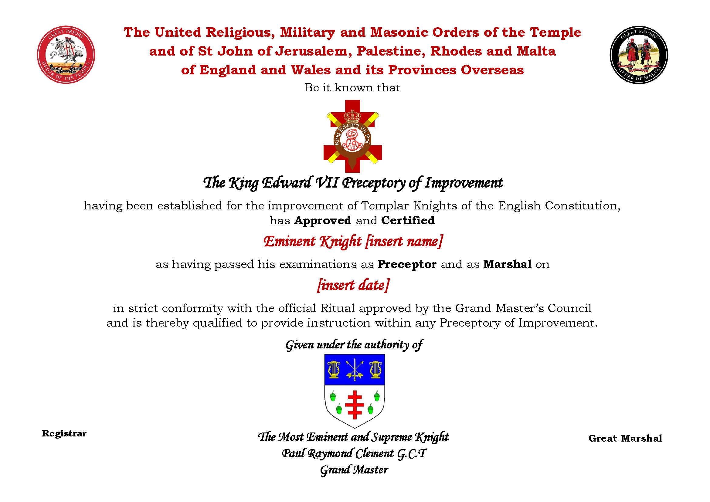Preceptors of the KEVII PoI are a select group of Knights who are among the most knowledgeable about our ritual. To become a KEVII Preceptor, a Knight must first perform the role of Marshal in strict accordance with the 'stage directions' that exist within the body of the ritual. Having achieved the necessary high standard, a Knight then takes the Preceptor's chair and performs the ceremony for the installation of a new Knight in a (near) perfect manner.